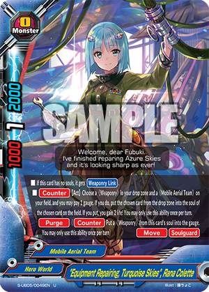 - [Counter]【Act】Choose a 《Weaponry》 in your drop zone, and a 《Mobile Aerial Team》 on your field, and you may pay 1 gauge. If you do, put the chosen card from your drop zone into the soul of the chosen card on your field. If you do, you gain 2 life! You may only use this ability once per turn.