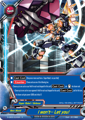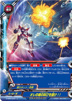 - [Counter]【Act】During each player's attack phase, call up to one 《Super Robot》 from this card's soul by paying 2 gauge less for its [Call Cost].