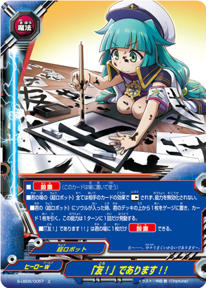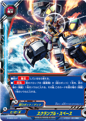 - [Counter] Put a 《Crew Trooper》 or 《Super Robot》 from your drop zone into the soul of a 《Battleship》 on your field. Then, put this card into the soul of a 《Battleship》 on your field.