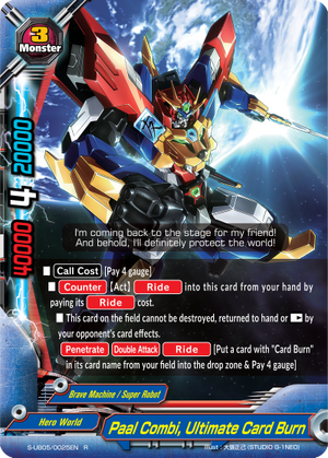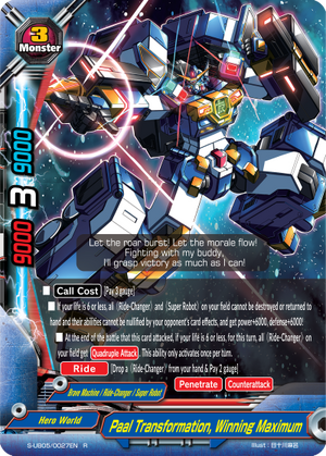 - [Counter]【Act】"Transcendence, G Language Finger!" You may drop a card with "Battle Poet" in its card name or a 《Super Robot》 from your hand. If you do, for this turn, all cards on your field get power+10000, defense+10000 and critical+2! You may only use "Transcendence, G Language Finger!" once per turn.