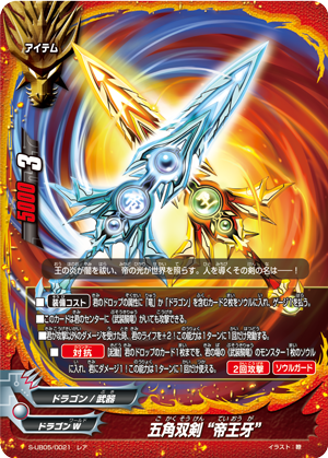 - [Counter]【Act】If your flag is "Dragon Zwei" or "Dragon Drei", you may drop this hand card. If you do, for this turn, all cards with "Dragon" in their attributes on your field cannot be destroyed or returned to hand and their abilities cannot be nu