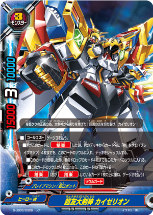 - [Counter]【Act】During each player's attack phase, call up to one 《Super Robot》 from this card's soul by paying 2 gauge less for its [Call Cost].