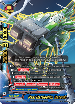 - [Counter] Put a 《Crew Trooper》 or 《Super Robot》 from your drop zone into the soul of a 《Battleship》 on your field. Then, put this card into the soul of a 《Battleship》 on your field.