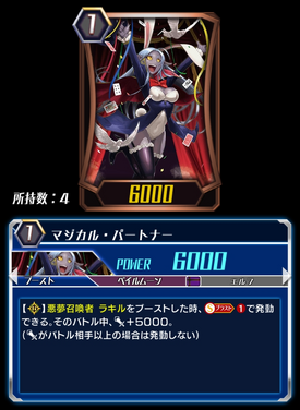 [R]: When it boosts a Nightmare Summoner, Raqiel, [S-Blast (1)] to get [Power] +5000 until end of that battle.