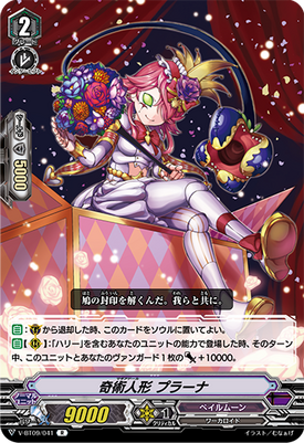 ACT [V] [1/Turn]: COST[C-Blast (1) & Discard a card from your hand], call up to two cards with "Magia Doll" in their different card names from your soul to [R], and they get [Power] +5000 until end of turn. If your opponent's vanguard is grade 3 or greater, you may call up to four instead of two.