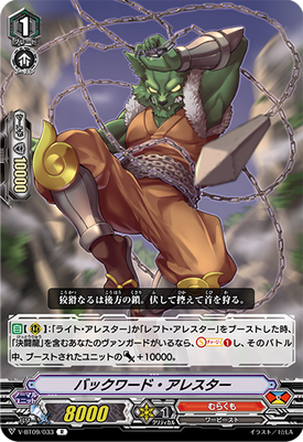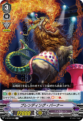 AUTO [V]: When it attacks, COST[C-Blast (1)], and [Stand] one of your front row rear-guards. If your soul has thirteen or more cards, [Stand] two rear-guards instead of one.