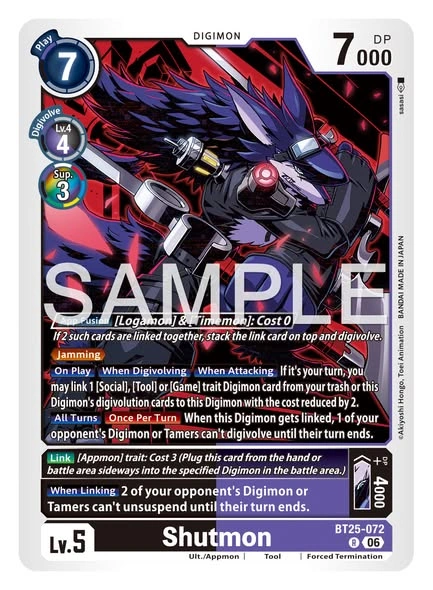 • Main: Delete all of your opponent's Digimon with the lowest DP. If this effect didn't delete, trash 1 of your opponent's Option cards in the battle area. Then, you may link this card to 1 of your Digimon on the field without paying the cost.