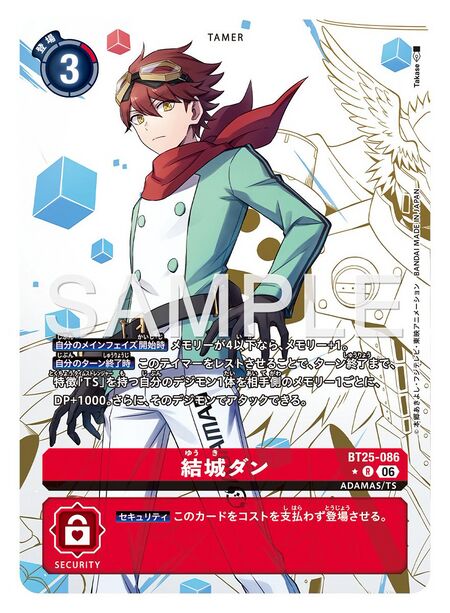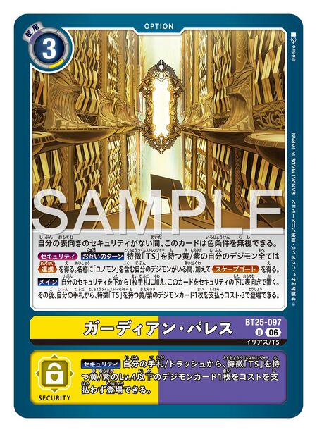 • Main: Add your bottom security card to the hand and place this card face up as the bottom security card. Then, you may play 1 yellow or purple Digimon card with the [TS] trait from your hand with the play cost reduced by 3.