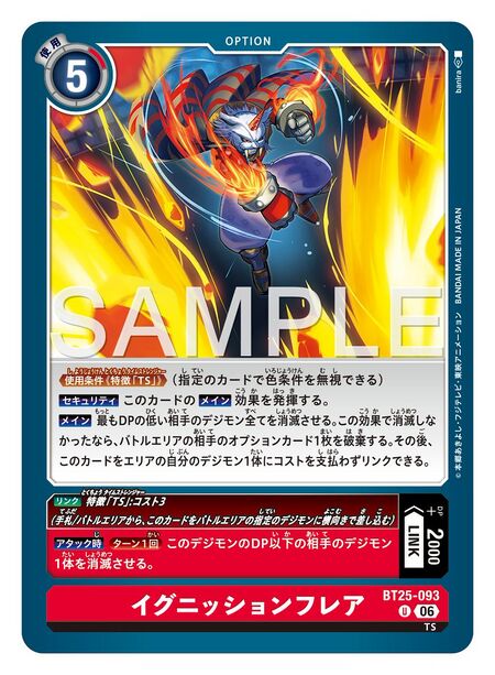 • Main Once Per Turn: By trashing 1 card with the [Flame] or [TS] trait from your hand, delete 1 of your opponent's Digimon with 4000 DP or less. If this effect didn't delete, Draw 2.