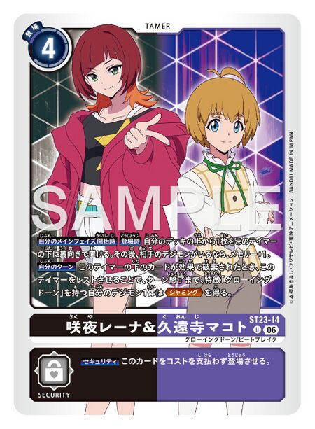 • Your Turn: When effects trash cards from under this Tamer, by suspending this Tamer, 1 of your Digimon with the [Glowing Dawn] trait gains Jamming for the turn.
