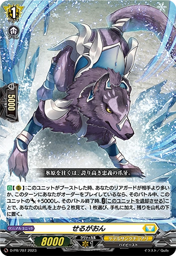 AUTO [R]: When this unit boosts, if you have more rear-guards than your opponent, or you played an order this turn, this unit gets [Power] +5000 until end of that battle, and at the end of that battle, COST[retire this unit], look at the top two cards of your deck, choose a card from among them, put it into hand, and put the rest on the bottom of the deck.